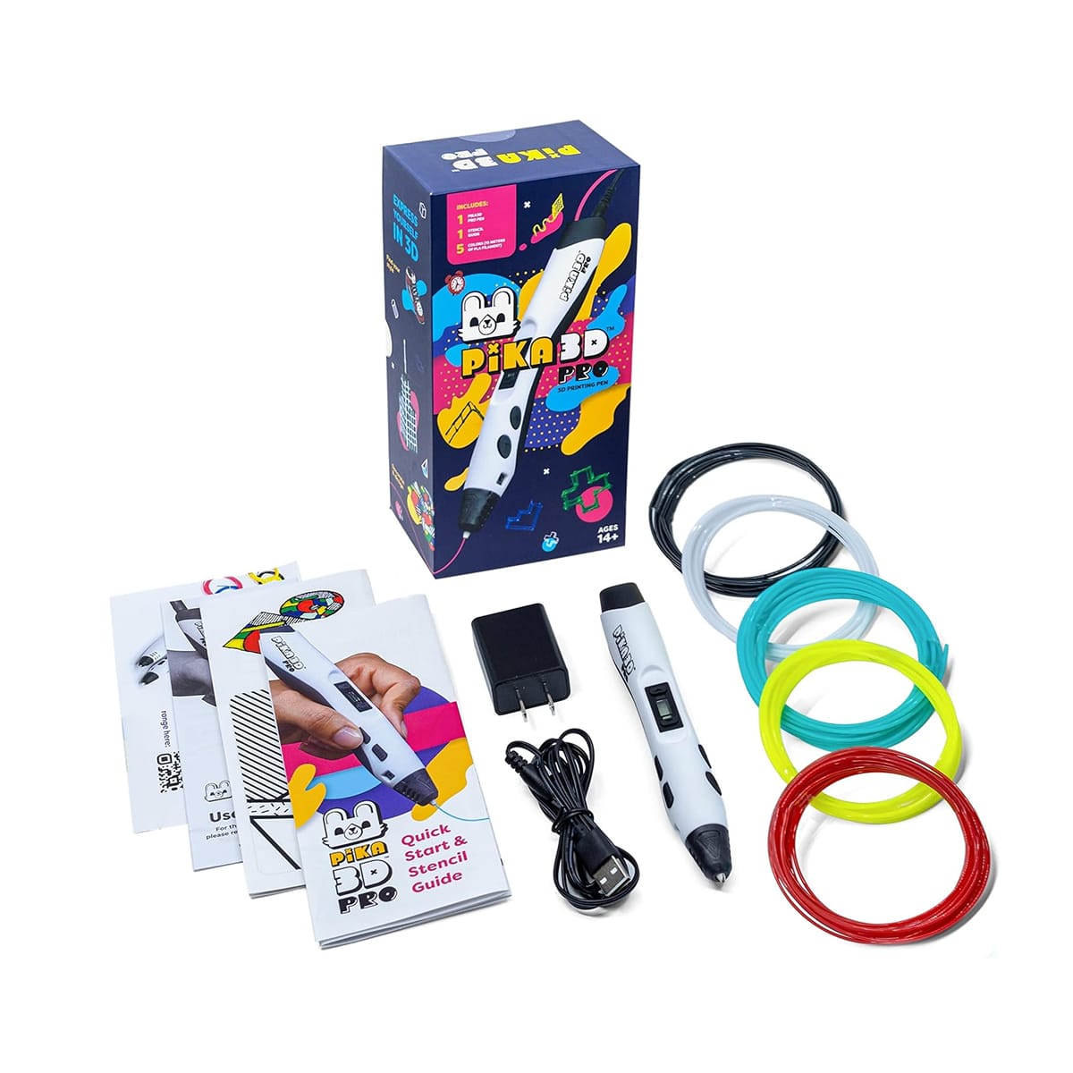 The upgraded model is slimmer and easier to hold, charges 50% faster than previous versions, and includes 50% more filament plus 10 new stencils. The added safety stand-by mode automatically engages during periods of inactivity, preventing accidents and conserving energy. The complete kit includes the pen, DoodlePad/Doodlemat, 72 strands of mixed-colour plastics, USB-C cable, and activity guide.