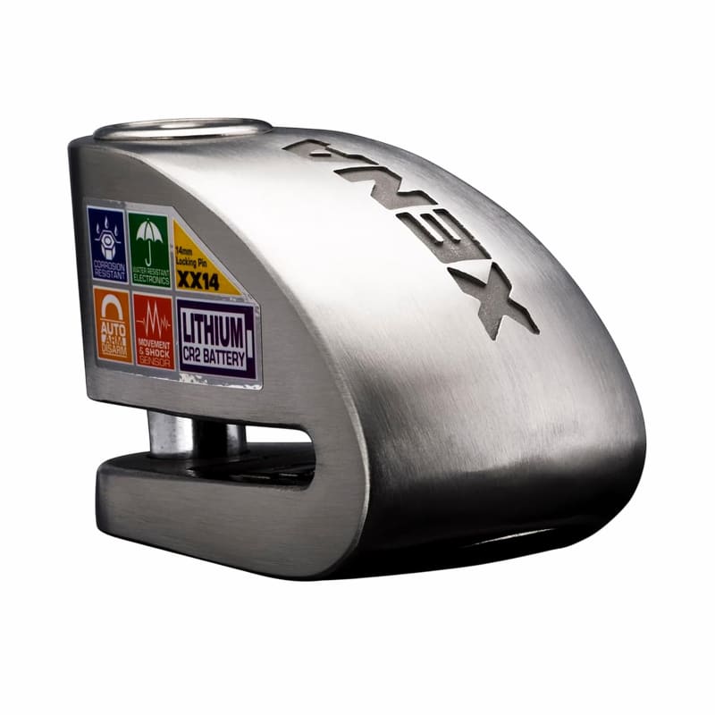 The Xena Alarmed Disc Lock distinguishes itself through mono-bloc 304 stainless steel body construction that eliminates potential weak points found in multi-piece designs. The carbide-reinforced double-locking pin system provides exceptional holding strength, whilst the robust 14mm pin diameter ensures compatibility with most motorcycle brake disc configurations.