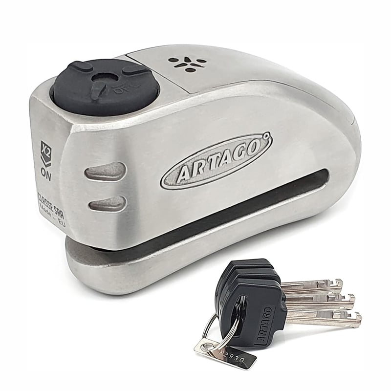 The ARTAGO Alarmed Disc Lock claims the distinction of being the most secure motorcycle disc lock currently available, featuring an exclusive patented S.A.A. triple locking system that represents genuine innovation in physical security engineering.