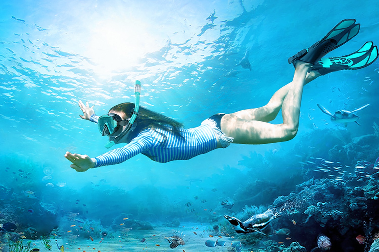 • Complete set includes mask, snorkel, fins, and travel bag