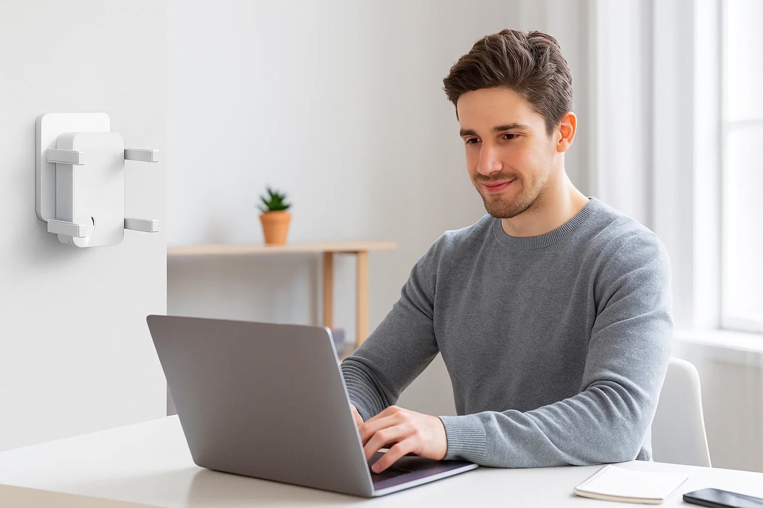 Universal compatibility with any wireless router or cable modem router ensures broad applicability, though optimal performance occurs when paired with WiFi 6 routers. The compact wall-plug design maintains a clean aesthetic whilst staying out of sight during operation.
